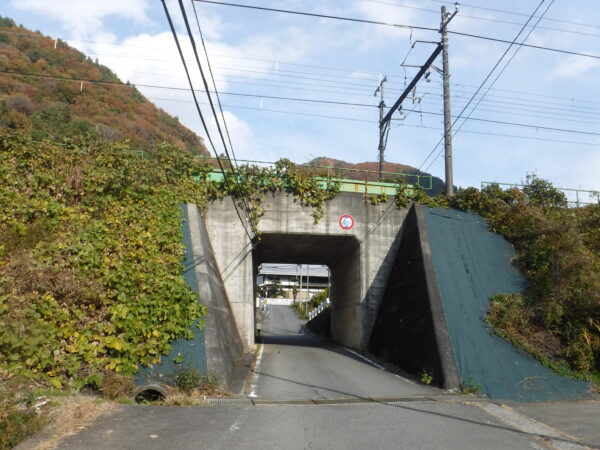 午後1時10分、富士急バス「吉久保入口」バス停に到着。左折し、JR中央本線吉久保ガードをくぐる。