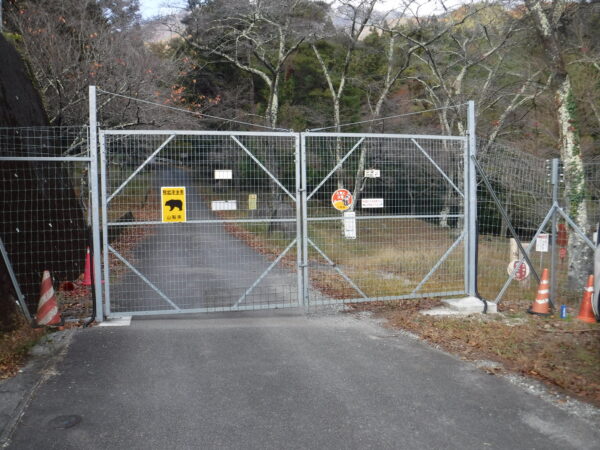 午後1時35分、動物遮断用のフェンスを開けて通過。通過の後にはフェンスを閉じる。