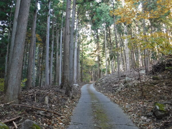 橋を一本わたり、道幅の狭いスギの林間道を登っていくと、沢の音が一段と大きくなった。