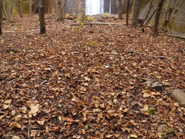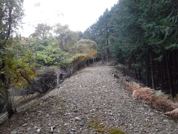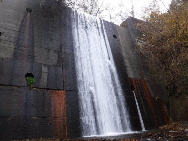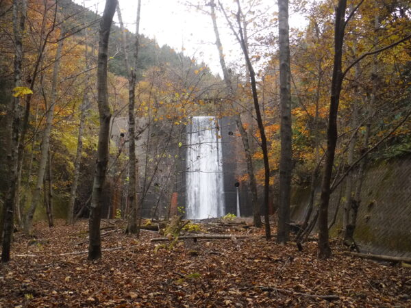 堆積地の小石を踏みならし、倒木を跨ぎ、スギの林間を抜けるように遡行していくと目の前に堤体が出現した。