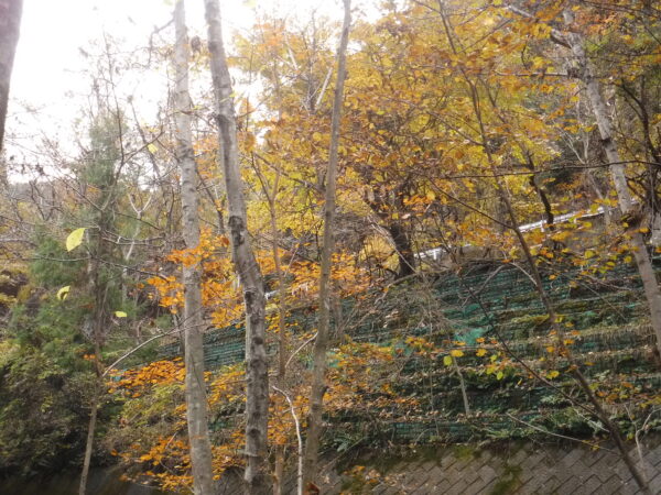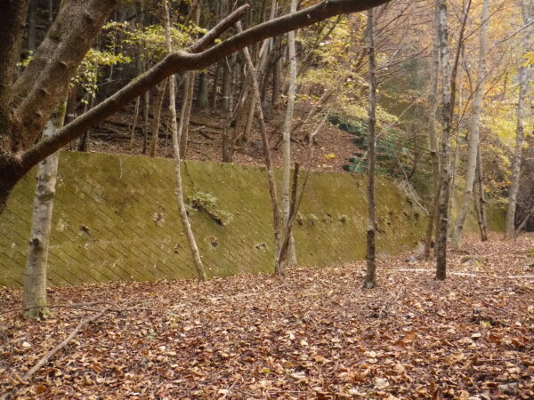 護岸より高いところ。内側には広葉樹が生え、外側にはスギ。
