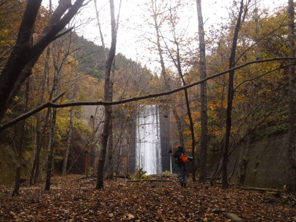 今回は背負子スタイルで堤体に向かう。ウエーダーを履くのは、堤体至近にたどり着いてから。