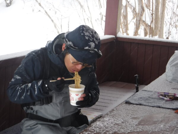 一年を通じて、なるべく木の生えている堤体前に立つようにしている。とくに、落葉樹が葉を付ける夏期のゲームにおいては、頭上を渓畔林の葉が覆っていて、空からの光を遮断してくれるようなところに立つ。