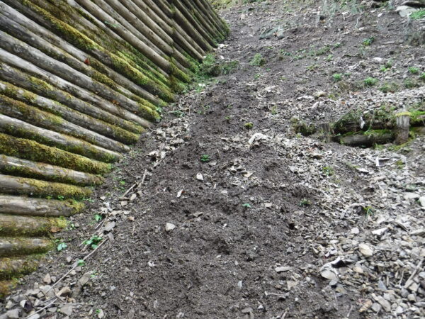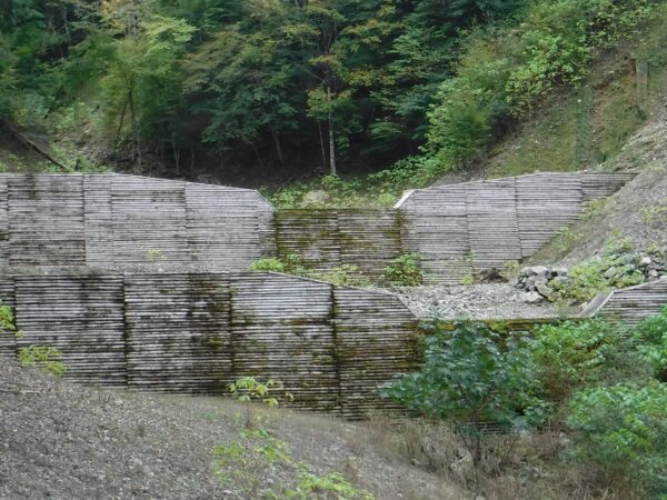 計5基の谷止工群。5基ともすべてコンクリート製。うち上流3基が水表・水裏丸太張りの堤体で、下流2基がコンクリートむき出しの堤体である。