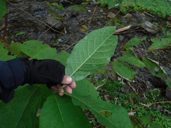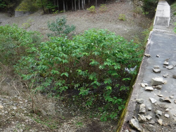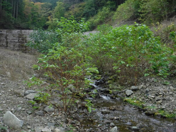 右岸側は堤体本体から下流に向かってフジキ、チドリノキ、ヤマグルマ、ケヤキ、サワグルミ。