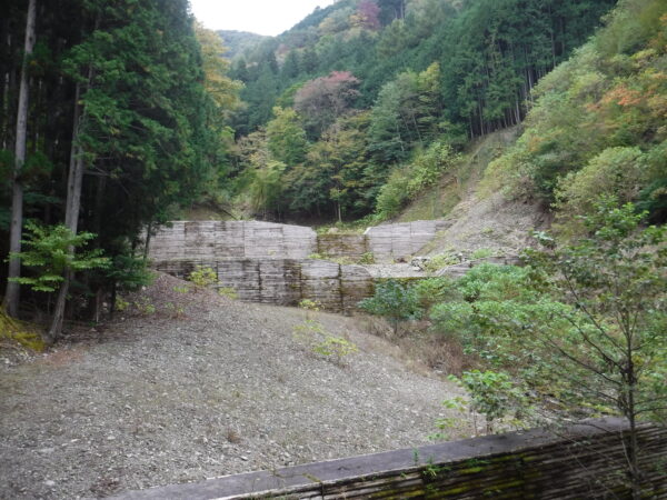 小菅村内、国道139号線「玉川」バス停から新玉川橋をわたり、林道を2キロほどすすむと冒頭からの画像にあるような堤体群に出会うことができる。