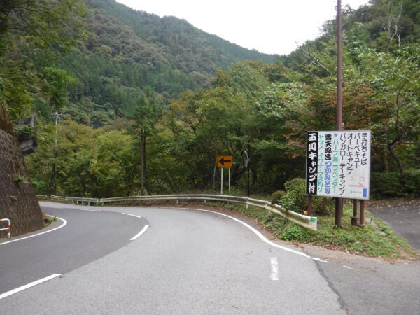 林道の途中にある「玉川キャンプ村」のサイトをを見ながら、土の道を下ってゆく。
