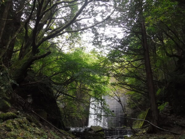 樹木は左岸側がスギの植林地。堤体から30ヤード付近にカヤの大木。50ヤード付近にオニイタヤが数本。