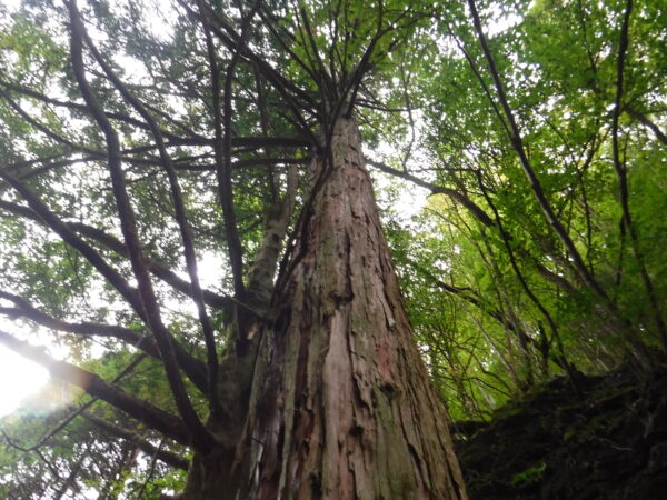 若干うえを向くほうが、樹木に声が当たりやすい。やはり、山でおこなう響きづくりにおいて樹木は欠かせないのだ。