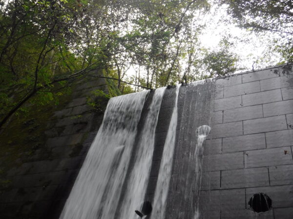 天端から落ちた水は水タタキ上に乗り、高さ1メートル程度の落差で完全に堤体から離れる。