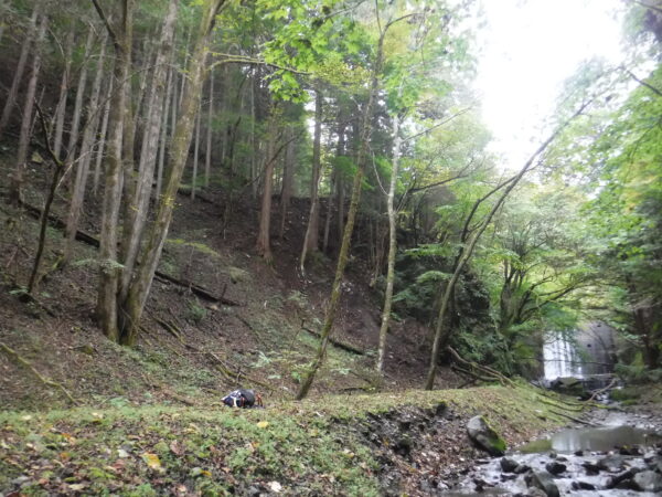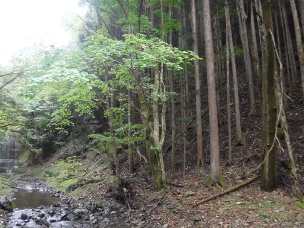 バックホウによって河道改修された直線的な流路は幅10メートルほど。左岸側すぐには植林地の斜面が迫る。対して右岸側には幅10メートルほどの平地。