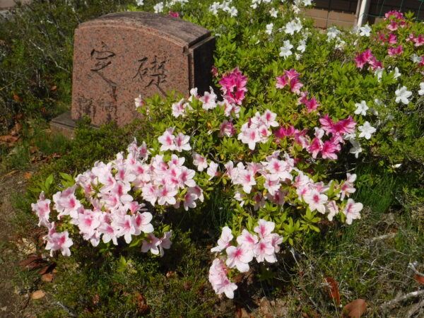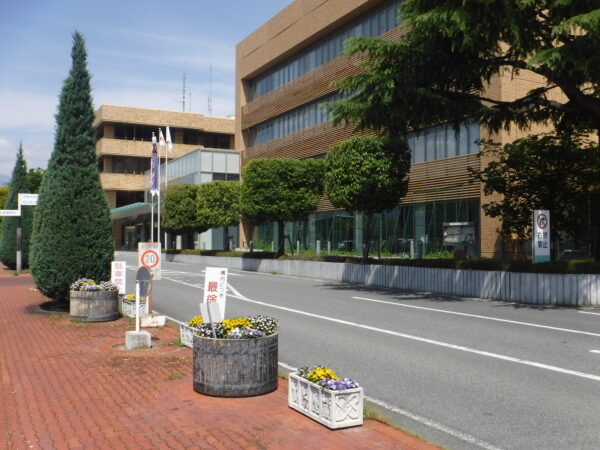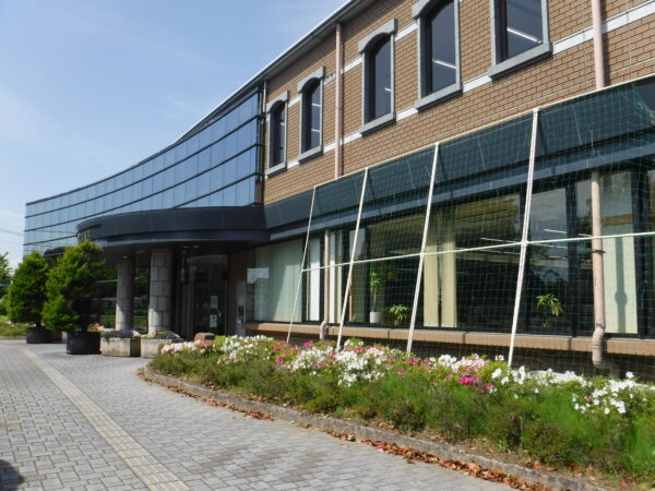 市役所と敷地を同じにする市立竜王図書館。その玄関脇にはツツジが咲いている。