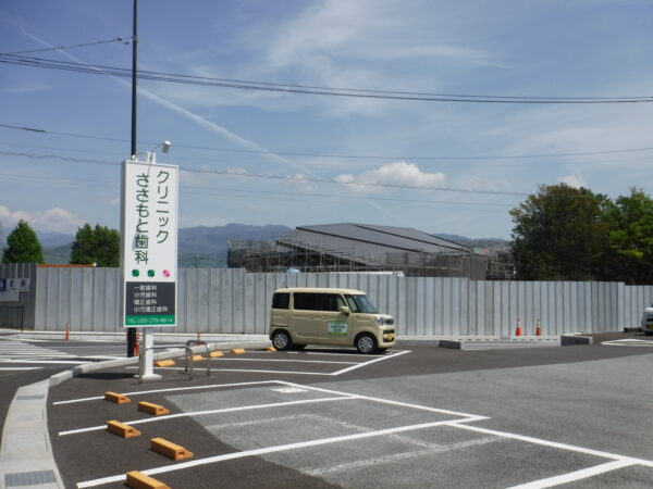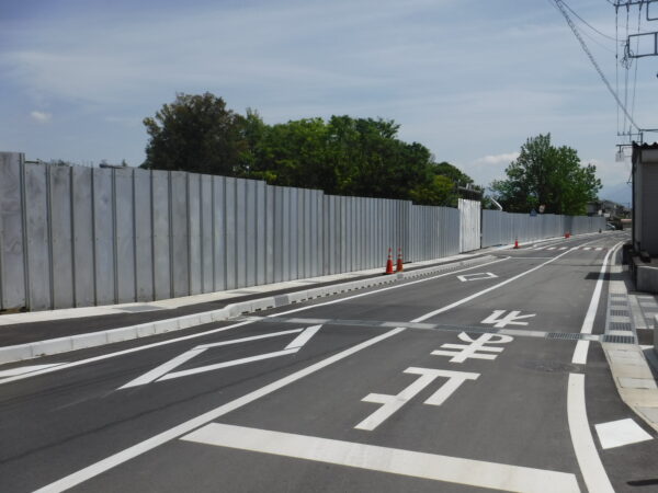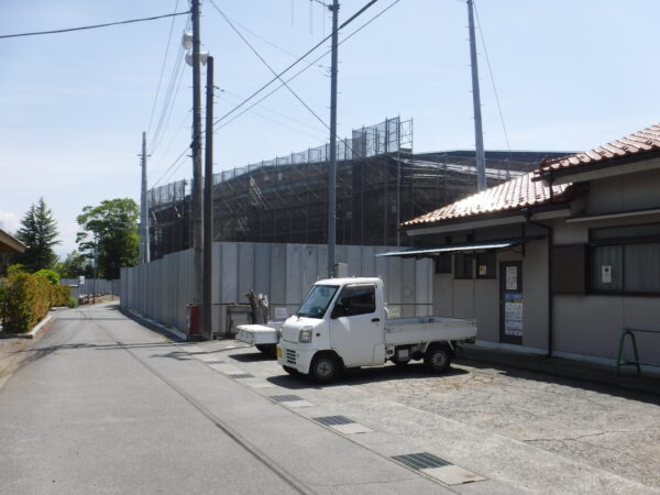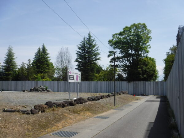 車を置いたのは甲斐市役所駐車場。そこから、市役所前道路を南へちょっと進むと安全鋼板に囲まれた建設現場があらわれた。