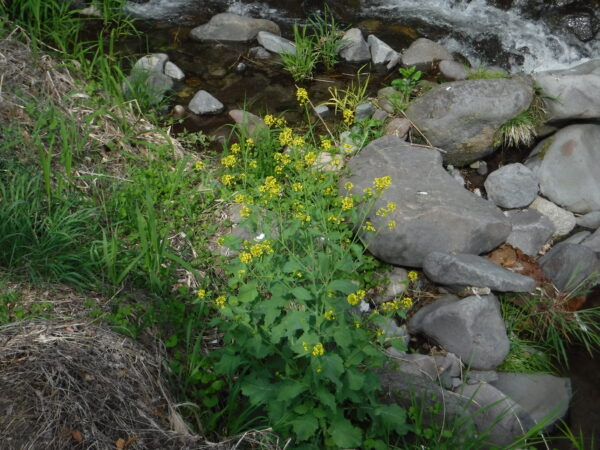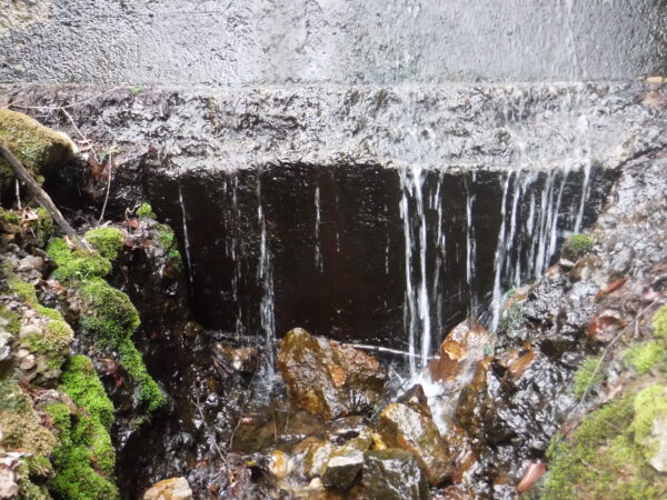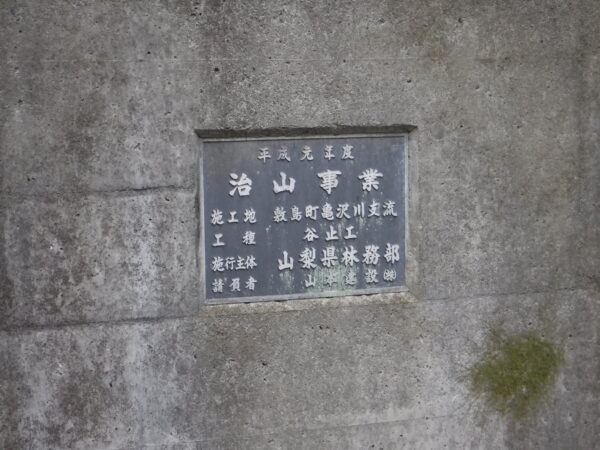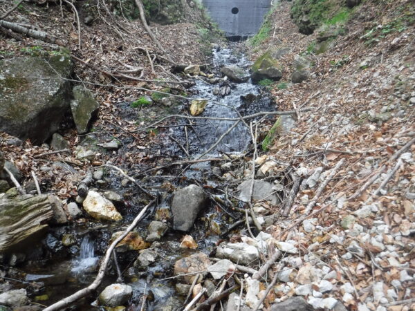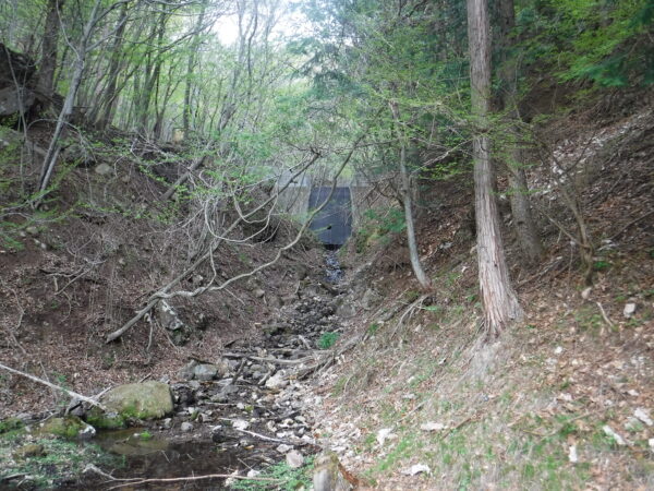 水量はほんとうに少ない。ここは前述の亀沢川の支流となる沢。ここより上流の流程長は不明であるが、距離的に見て甲斐市・北杜市の分水嶺が非常に近い。