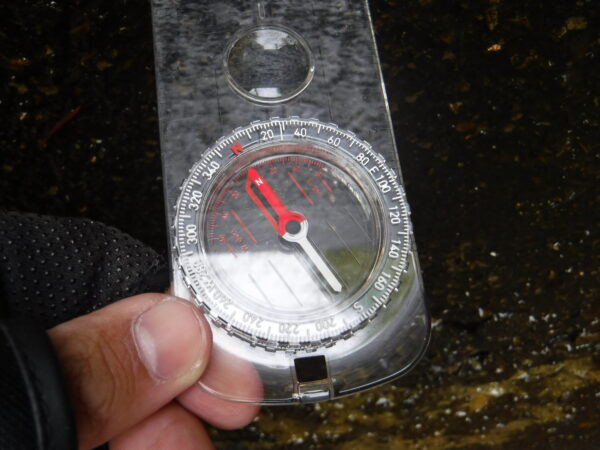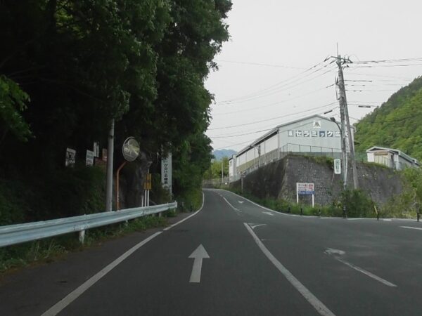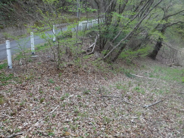 午後4時15分、林道を200メートルほど下る。下ったところにあらわれるのがカーブミラー。そのカーブミラー手前、林道から分岐しているブルドーザー道があるのでブルドーザー道に逸れる。