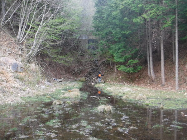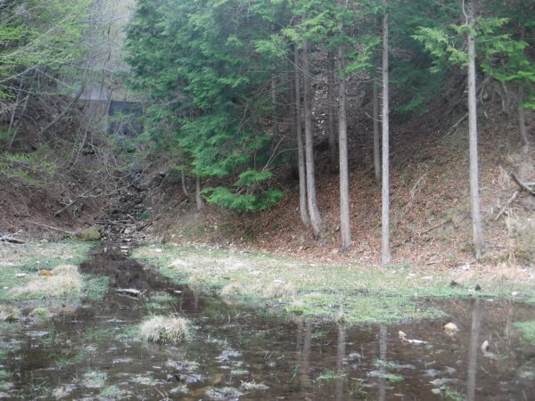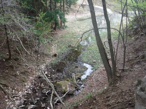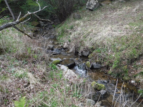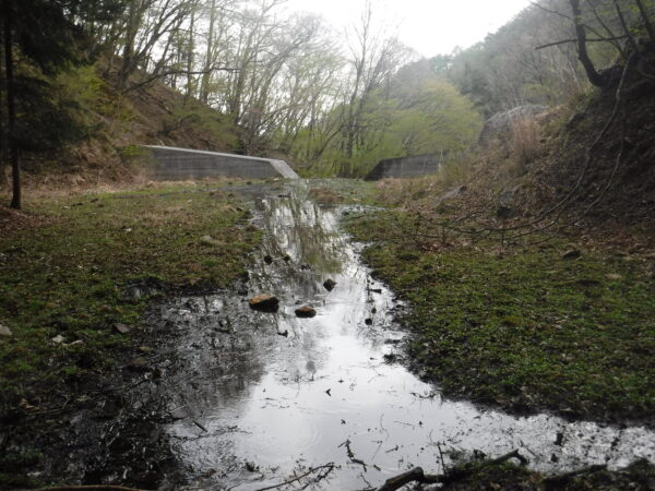 谷止工を右岸側から2基とも巻く。上流側の谷止工を巻くと湿地帯があらわれたので湿地帯に入った。