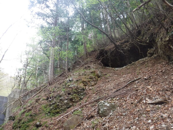 堤体直後(約15メートル以内)では岩盤上を。以降は堆積するガレの中を。