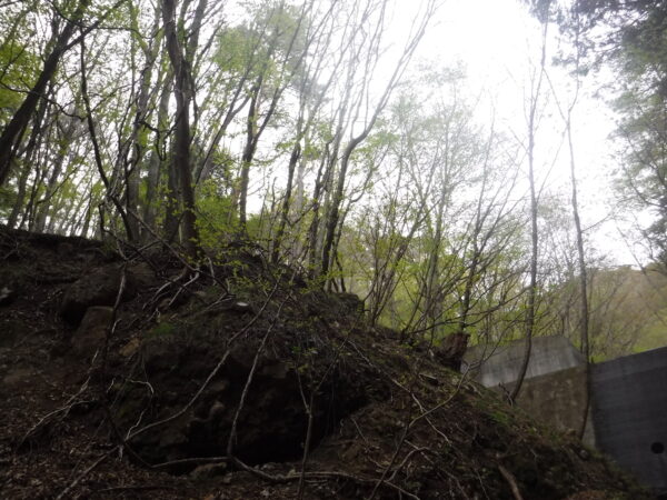 堤体は見えている基礎部分から放水路天端まで6メートルほど。この堤体をボリュームアップさせるには斜面の尺を利用する。