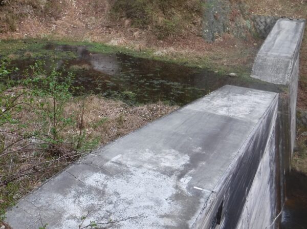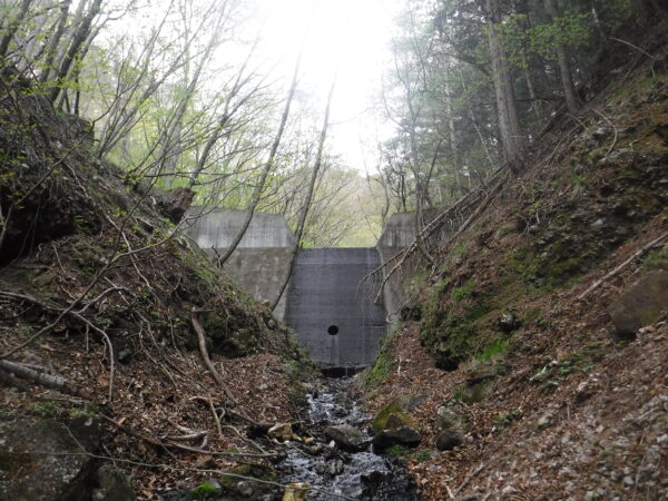 湿地帯をほんの数十メートル遡行すると、眼前に谷止工が。